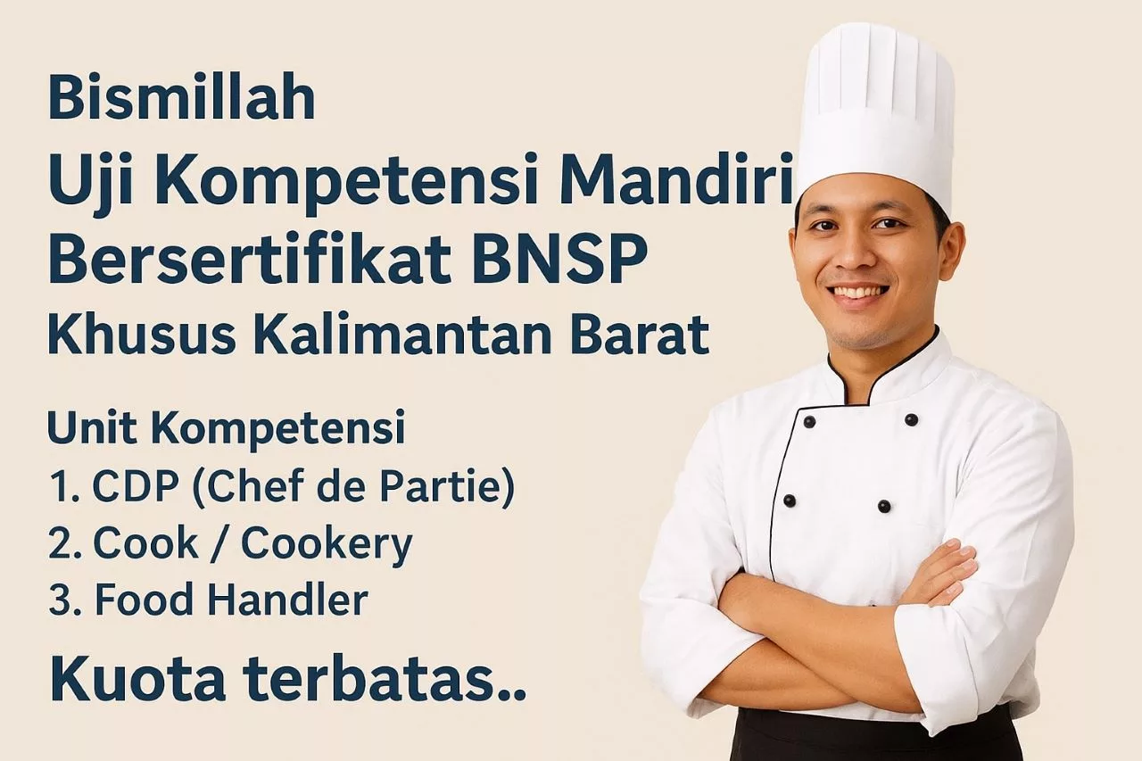 Untuk mendukung tenaga kerja kuliner di Kalimantan Barat, kini telah dibuka Program Uji Kompetensi Mandiri Bersertifikat BNSP.